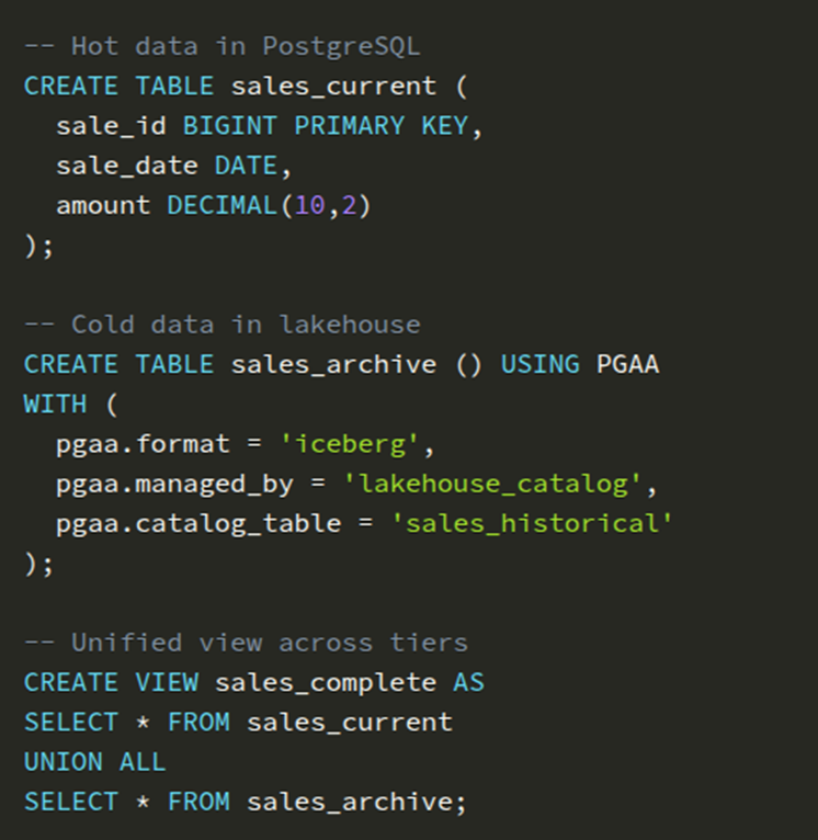 Sí. PGAA permite combinar tablas activas en la base de datos operacional con tablas externas en el lakehouse y unificarlas a través de vistas.