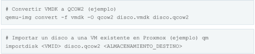 - Convertir discos (p.ej., VMDK a QCOW2/RAW).
