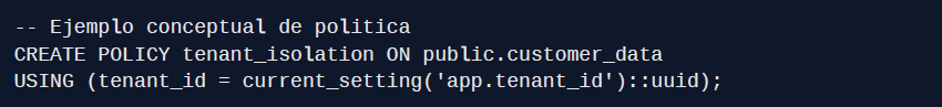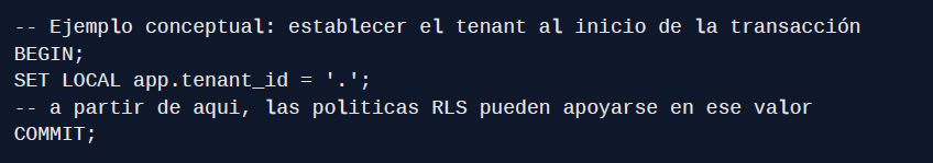 - Contexto por sesión/transacción: la aplicación establece el tenant en la conexión (o transacción) y las políticas lo leen.