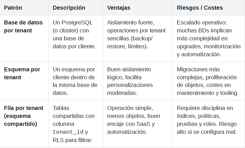 Esta guía se centra en el patrón fila por tenant con RLS, que suele ser el más eficiente en operación cuando el producto es homogéneo y el objetivo es escalar.
